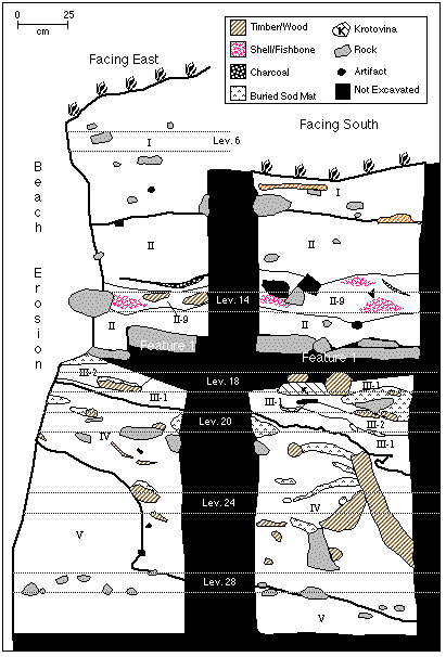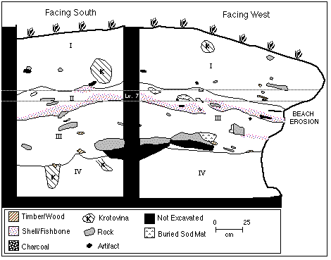 Excavators made a profile drawing of two walls from each finished test unit, and soil samples were retained from most strata exposed in profile. I also made a sketch map of the exposed beach cutbank in order to target midden areas that might prove useful for faunal recovery, and refined my sketch profiles in two areas of the beach to help fix stratigraphic sequences for nearby test units. Soils were mapped with a methodology that favored identification of buried surfaces and depositional episodes (Stein 1990). I designated proposed major depositional sequences with Roman numerals; substrata that may represent single depositional episodes within the stratum are designated with Arabic numerals. Therefore, Stratum III-1 indicates the first identified substratum in major Stratum III. Conjectured soil types and horizons were noted using basic soil science terminology (Holliday and Goldberg 1992).