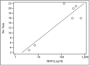Using the arithmetic manipulations described above, I have corrected measures of abundance (bone weight, NISP, and MNI) for variations in the volumes of excavated units. However, these manipulations do not accurately represent a predictable change, since the number of taxa present in a sample varies as a function of NISP or MNI. That is, as the actual number of specimens or individuals rises, the taxonomic richness of a sample should also rise (Davis 1987;Grayson 1981). I will address this difficulty in greater detail in Section 5. Arithmetic manipulations also produced non-integral numbers for measures that are actually counts of individuals (specimens or animals). This leads, for example, to nonsensical measures like "1.8 Microgadus individuals" or "0.6 individual Odobenus bones." These fractions do not represent the observation of fractions of individuals, but rather the number of individual bones or animals per 0.1 m3 of excavated soil. I have avoided rounding corrected measures to the nearest whole number, since this would add a decimal place of uncertainty to my analyses.