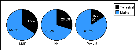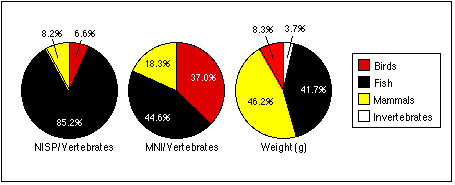 From the nonrandom, discretionary samples described in the preceding section, I analyzed 3739 individual fish, bird, and mammal specimens; these and the invertebrate remains weighed 4344 g in total (Table 4.1). I identified 2388 specimens; much of the remaining material consisted of undifferentiated bone, heavily altered by perthotaxic (post-death and pre-burial) and anataxic (post-burial) taphonomic factors (Lyman, 1994: 354–416). This was especially the case for mammal bones, which contained a preponderance of pulverized, crushed, burned, and eroded specimens.