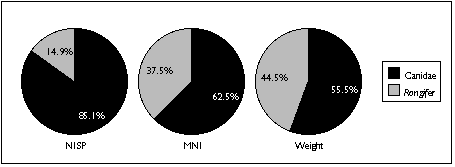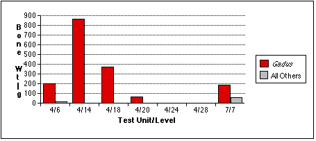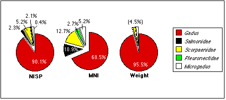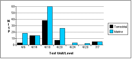 Many of my analyses depend on the distribution of faunal remains represented by minimum numbers of individuals. Davis (1987:35–36) questioned the utility of MNI as a measure of abundance between mammalian taxa, although his apprehensiveness concerned comparisons of MNI in large assemblages, subjected to more statistical manipulation than the small Nash Harbor assemblage. Wheeler and Jones (1989: 149) also expressed reservations about using MNI to rank fish remains at a site. Grayson (1981) noted that quantitative faunal data are largely dependent on sample size, an imporant caveat given the small size of the Nash Harbor sample for all taxonomic groups other than fish. Hesse and Wapnish (1985: 114) addressed the spatial distribution of elements in determining MNI; they wondered how far apart two elements must be—horizontally or vertically—before they can be considered as deriving from two individuals. Ultimately, I sided with Grayson (1973) in acknowledging the shortcomings of MNI and other derived data, and utilized them to construct indices of ordinal, rather than absolute, abundance. That is, I could say that certain species were more abundant than others, but could not address how much more important.