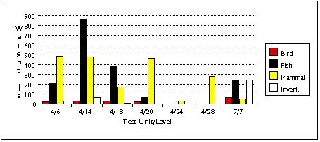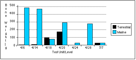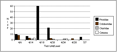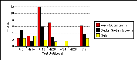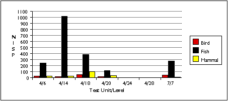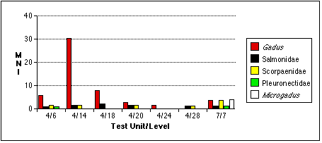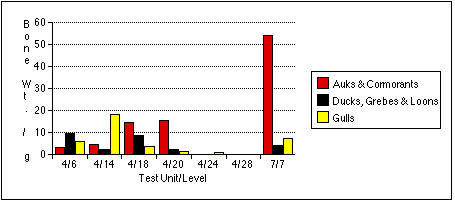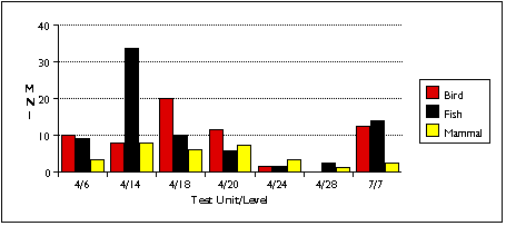 After identifying remains from excavation samples and computing MNI from those remains, I identified elements from the bulk samples associated with each analyzed unit. Since the volumes of excavated levels and bulk samples varied, and since the bulk samples represented only a tiny fraction of the total soil in any one excavation unit, I could not with any confidence derive meaningful quantitative data from bulk samples. However, the identification of the bones of very small animals in some bulk samples suggested that Nash Harbor residents exploited animals whose remains were not recovered in the 1/4" screen samples.