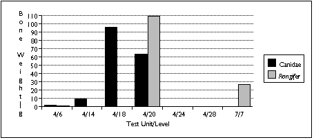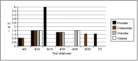 The next phase of analysis involved the determination of minimum number of individuals (MNI) for each taxonomic group identified above. Minimum numbers provide an estimate of the number of individuals represented in a sample. Using the presence of elements diagnostic of particular taxa—and making some consideration for size and age of the individuals at death—I could derive MNI for all identified taxonomic groups. Except in two instances (the TU4, Level 18 and Level 20 samples, and the Level 24 and Level 28 samples), I regarded each sample unit as discontinuous with other samples, so the MNI for any one species present in a given sample was figured separately from MNI for the same species in other samples.