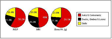 Ethnohistorians have represented Nash Harbor as a sealing and cod-fishing camp, and a center for cliff-birding (Griffin 1996; Lantis 1946). Zooarchaeological analyses largely support this representation, although the variety of animals actually found in the faunal sample reveals a much more diverse economy. The Ellikarrmiut focused their attention on cod, seals, cliff birds, and walrus, but also took tomcod, salmonids, mussels, ducks, grebes, loons, sea lions, and caribou. They probably traded many of the birds they caught to people living on the eastern portion of the island, and to mainland Yupiit peoples. Excavation and recovery techniques have masked the importance of other animals, especially herring, and the differential butchering and transport of caribou remains may underrerpresent the actual importance of these animals. The Ellikarrmiut may have also taken fur animals such as wolves, foxes, and weasels or minks.