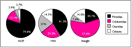 Several anatomical elements proved easier to identify and more information-rich than others. Following Wheeler and Jones (1989:150), I identified certain elements of fish skeletons that preserve well, are easily identified to species, and either occur singly or in pairs. Especially informative fish elements include heavy cranial bones along the medial line (and thus occurring once in a single fish). Some paired elements also proved informative, especially premaxillae, maxillae, and dentaries. Because of extraordinary preservation conditions at Nash Harbor, I could also distinguish elements, such as lightweight bones in the occipital and otic regions, that in other contexts are usually lost to taphonomic factors. Davis (1987:35) noted elements of mammal skeletons providing the same utility, including mandibles, bones of the shoulder and pelvic girdles, and limb and foot bones. The small size of the analyzed mammalian sample limited the number of these indicator bones, and the extent of the comparative collection meant that many bones, especially carpals and tarsals, remain unidentified. Bird remains proved the easiest to identify and often the best preserved. Bird leg, foot, and wing bones, and bones of the sternal and shoulder regions, were especially informative. Analyses at this stage produced number of individual specimens (NISP) data, which reflect the number of bone fragments identified to a particular taxon. In a few instances, I could refit broken bone fragments, but while these refits proved informative for generation of minimum number of indivual data (discussed below), I treated all fragments found at the time of analysis as individual specimens. In other words, if a single bone were found in two fragments, and I refitted those fragments, they still represented NISP = 2.