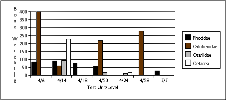 Excavation of TU4 below 240 cm below surface partially exposed the anterior occipital margin of a large walrus skull, protruding from the west wall into the unit. After excavation of the unit, Broyles and I removed this skull and some surrounding soil. Two holes had been drilled in the nasal/maxillary region of the walrus skull, and the tusks removed by tapping on a dowel or wedge inserted through the drilled holes. As a byproduct of sample unit selection (see Section 3, below) this skull and some other walrus remains from Test Unit 4 are not included in the sample of analyzed faunal material.