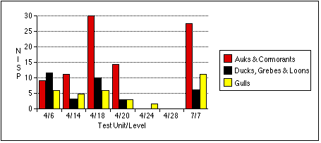 The analyzed materials are not a random or unbiased sample of the Nash Harbor assemblage. In fact, I chose samples in a decidedly nonrandom fashion, selecting sample units based on sample size and apparent diversity, not for overall representativeness. The analyzed samples represented a tiny fraction of the entire Nash Harbor assemblage, most of which derived from only two midden deposits. The 1/4" mesh used for screening excavated soils led to a bias towards larger animals, or animals with larger remains. I expected that this would lead to an underrepresentation of small fish (e.g. Clupea sp.) and finely pulverized shell fragments, for example. Analysis of faunal material retrieved from bulk soil samples helped correct this bias, at least by indicating that certain species may have been missed. I did not attempt quantitative analyses from bulk samples however, as they are far too small (usually about 2 liters) to represent an entire excavation unit and not uniform in size.